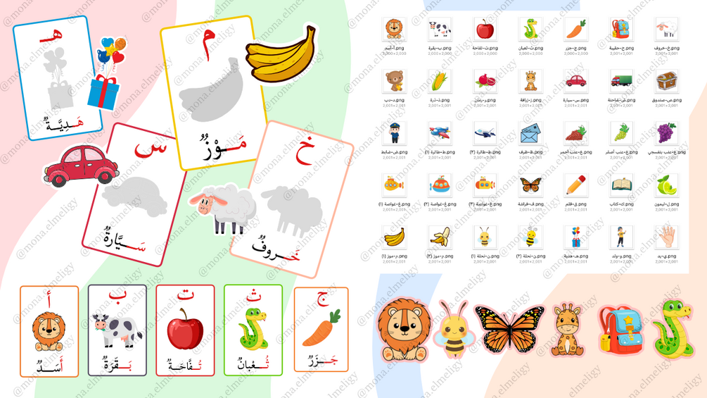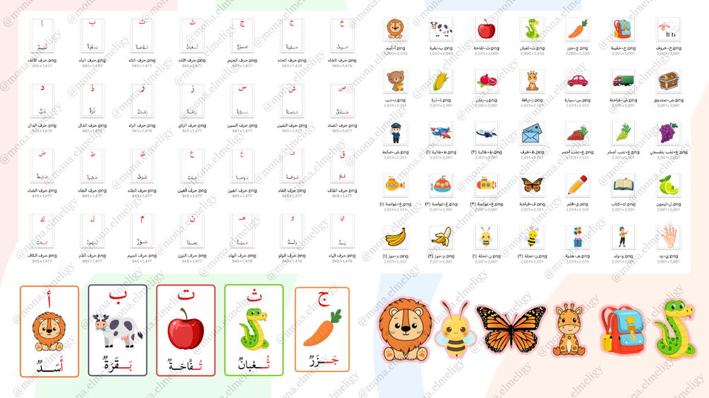 بطاقات الحروف الأبجدية العربية مع صور توضيحية لكل حرف بأعلى جودة