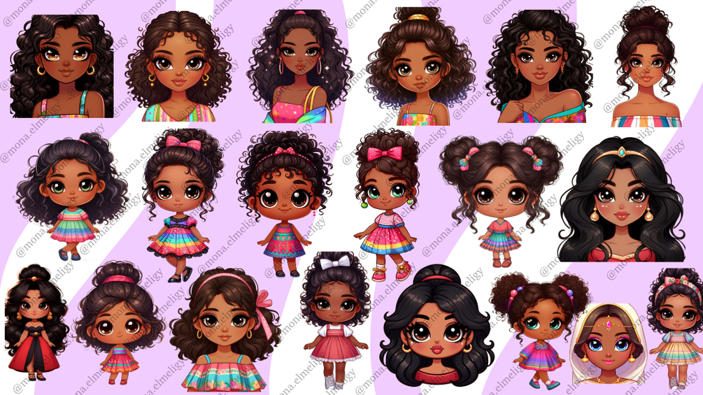 Charming collection of adorable African girls clipart, ideal for various projects, all in high-quality resolution